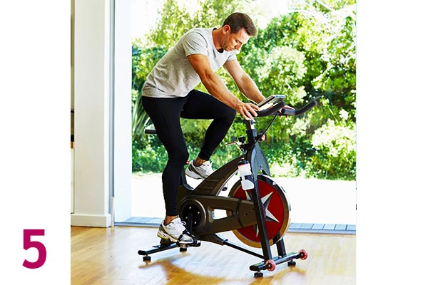 با دوچرخه ثابت، مدت 30 ثانیه با تمام توان و با حداکثر سرعت پدال بزنید. و سپس 4 ثانیه سرعت خود را کاهش دهید. این کار را 15 الی 30 دقیقه تکرار کنید.